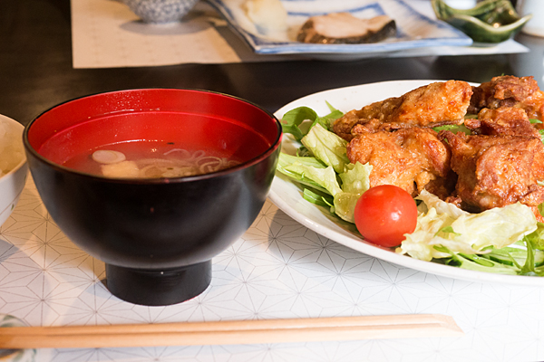 この日は肉が鶏の唐揚げで、魚がブリの塩焼きだった。