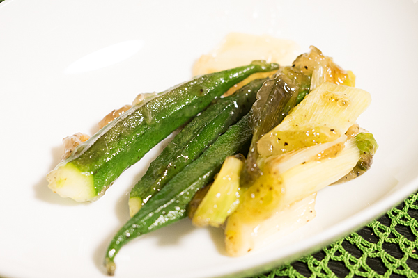 オクラを軽く湯がいて、水気を拭いて、長ネギと一緒にビニールに入れて、塩、コショウ、和風だしの素で下味をつけ、カタクリ粉をまぶして揚げ焼きにする。