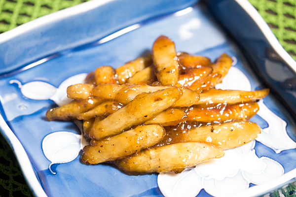ゴボウにカタクリ粉をかぶして揚げ焼きにして、酒、みりん、しょう油、砂糖、塩、コショウで味付けをする。