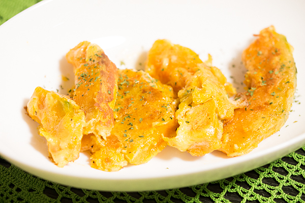 カボチャをレンジで加熱した後、カタクリ粉をまぶして溶き卵にくぐらせて焼く。